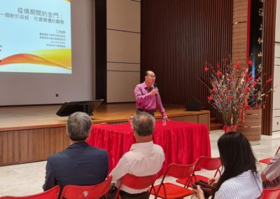 2023年1月28日下午,台湾师范大学东亚学系教授、国际与社会科学学院院长江柏炜教授,应金门会馆文教部之邀,在金门会馆礼堂主讲“疫情期间的金门及疫后展望”,共有超过70位会员乡亲,公众以及学者出席。讲座后也放映了微电影“落藩之后”,讲述新加坡年轻人返回金门寻根的故事。